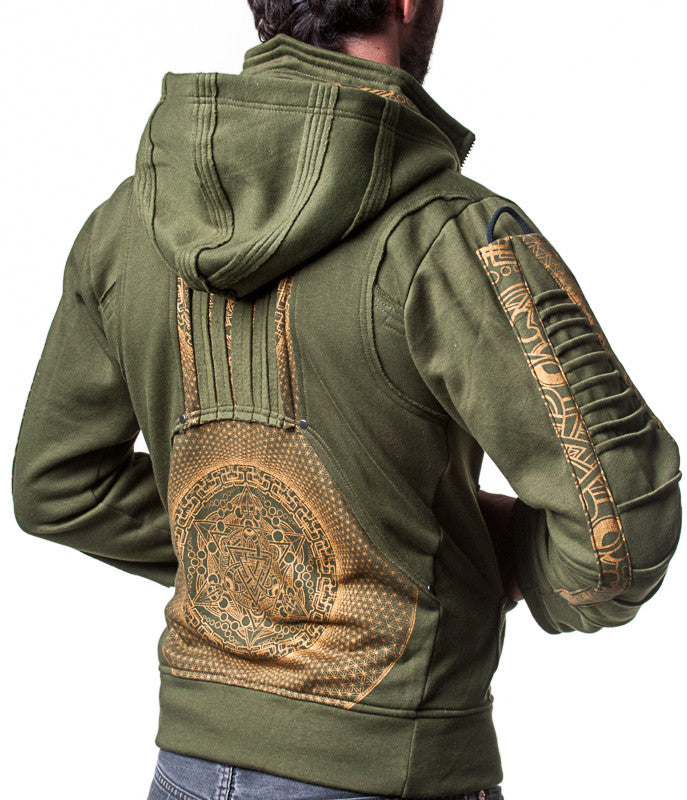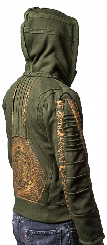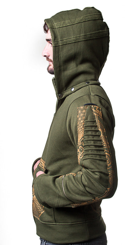 Details: The Moto is hand printed with original art by Carey Thompson. It has a detachable hood, collar, size jaw strings to adjust the length of the arms. It has a zip pocket on the cuff, and a small velcro pocket on the back shoulder. Each hoodie is hand printed with intention.
