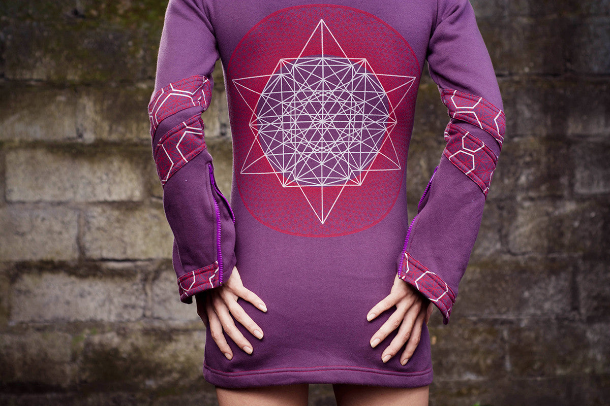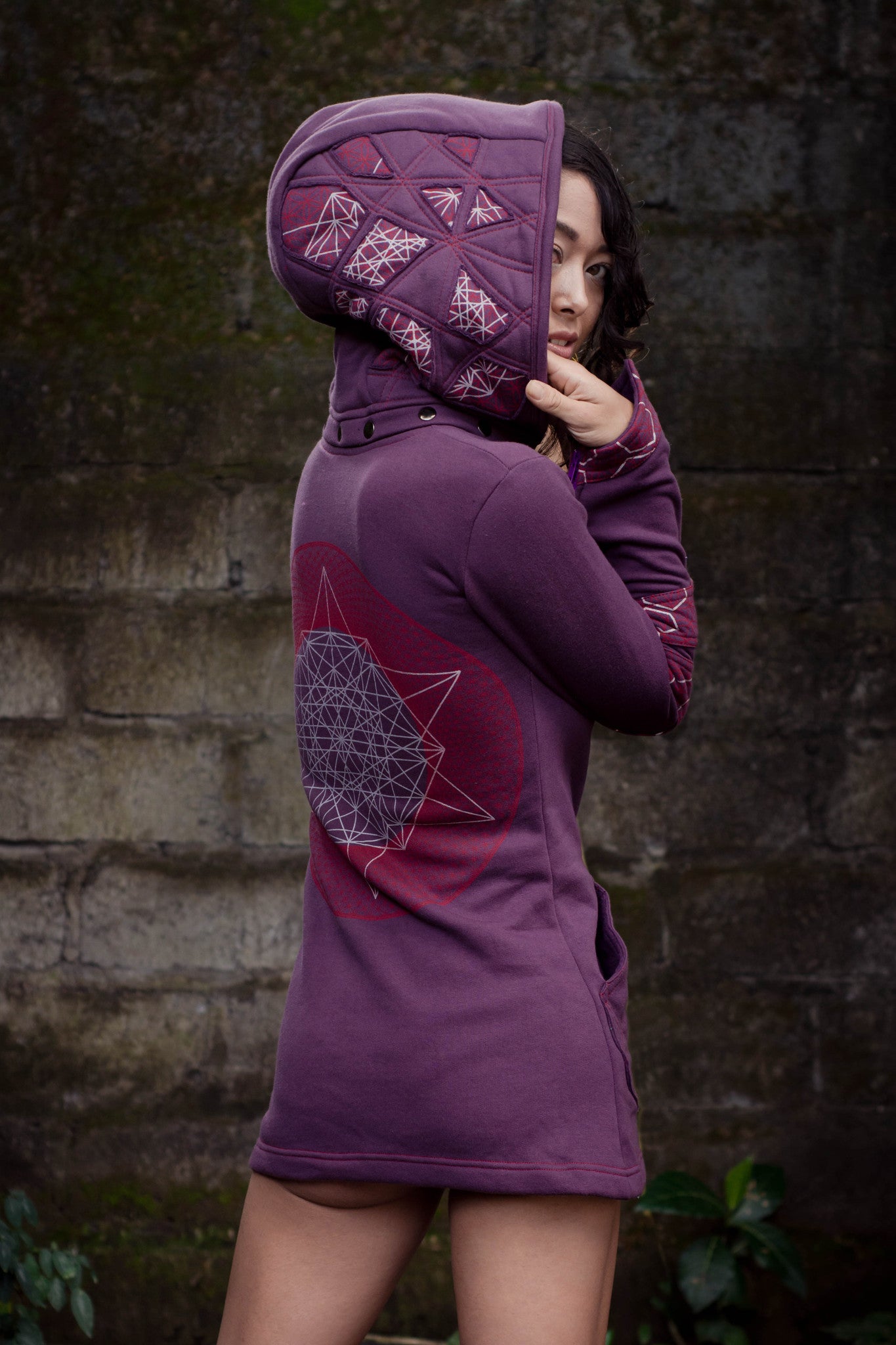 Fabric: 100% Cotton FleeceDetails: Hand printed original art Star Metrahedron and FOL. Triple layer applique hoodie, detachable hood, adjustable zip arms, and front applique pockets.