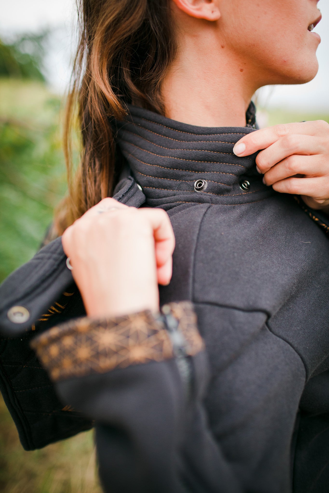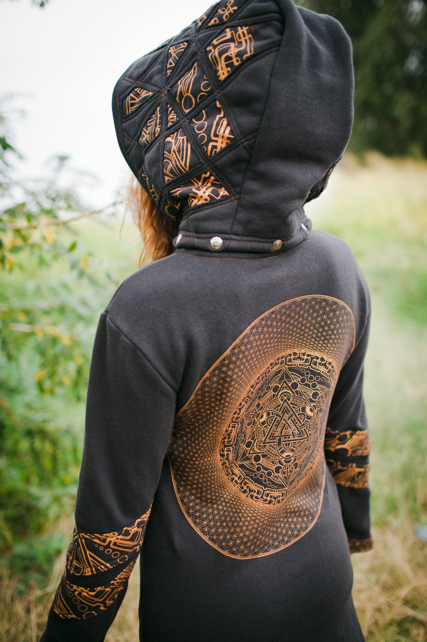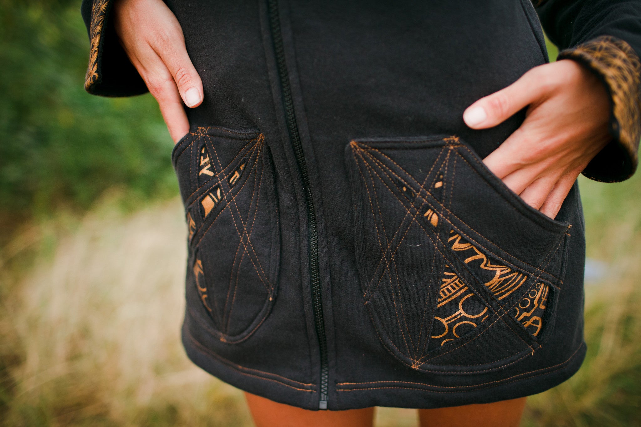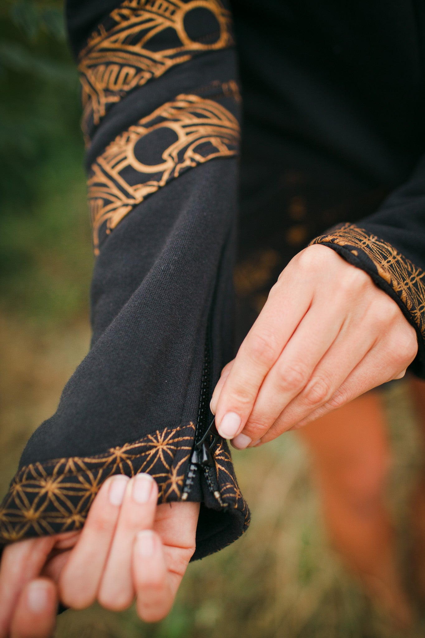 Fabric: 100% Cotton FleeceDetails: Hand printed original art Carey Thompson in Gold. Triple layer aplique hoodie, detachable hood, adjustable zip arms, and front aplique pockets.