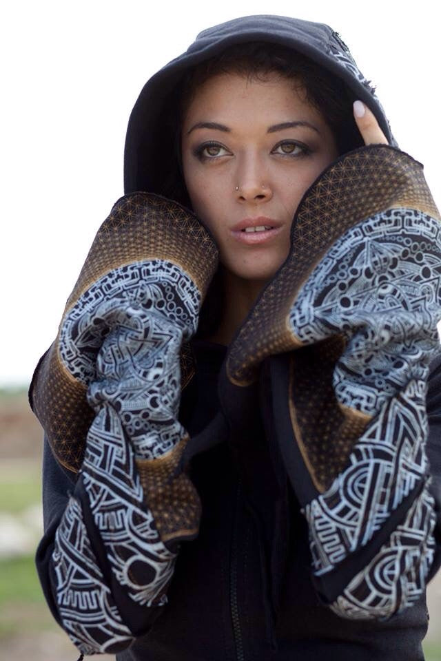 Details:  Carey Thompson Mandala Print on Back Gold and Silver, Mandala print on a triple layer applique hood, mandala print applique on bell arms.